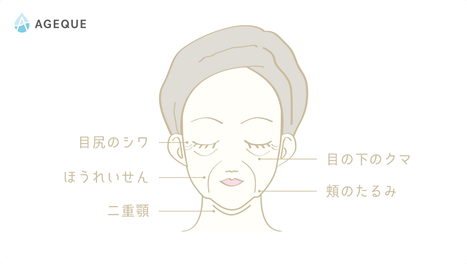 顔全体がたるみ下に落ちることで、シワやほうれい線、目の下のクマなどを作り出します。
