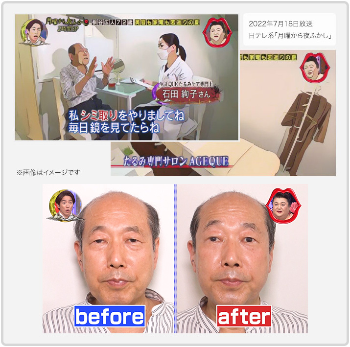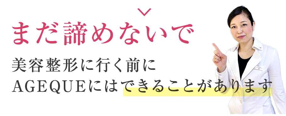 加齢と共に衰える肌のハリ、ツヤ、シミ、シワ。そして、たるみ。 特に30歳を超えて、顕著に感じ始める方が多いのではないでしょうか? そんな悩みを解決するために、たるみ専門サロンAGEQUEはオープンしました。 通常、アンチエイジングと言えば、美容整形を考えるのが一般的ですよね。 一昔に比べて、整形をする人が増えました。 でも、お肌を切るということに抵抗が多い人も事実。 実際、整形で多くの人が取り返しのつかない失敗をしています。 どの先生が信頼できるのかもわからないですし、二の足を踏みますよね。 また、美容整形をすれば、死ぬまで美しい肌というわけではありません。 美容整形に山ほどお金をかけている芸能人でさえ、「劣化」という言葉を使われてしまうくらい残酷に歳をとります。 劣化だけならまだしも、整形を失敗すると、その後の人生取り返しがつきません。 芸能人ではなく、一般の方なら尚更ですよね。 AGEQUEでは、美容整形は怖い!でももっと何かできることがあるはず! 自然に歳を重ねていきたいけど、ナチュラルの中でやれることはやっていきたい! そんな方のために誕生しました。 できるだけナチュラル、そして美しく齢を重ねるを合言葉に、加齢とうまく付き合いながら美しく付き合う方法を追求する。 それが、AGEQUEです!