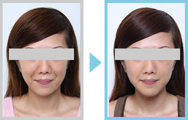 とにかくクッキリと濃いほうれい線、そして全体的にくすみが非常に強い事で、 プラス10歳ほど年齢が上に見える老け顔になっていました。 施術を6回行い、最初これだけ濃かったほうれい線がしっかり薄く!! 垂れ下がった頬のたるみをしっかりアップさせたことで、ほうれい線が薄くなり、血行不良も改善され、全体のくすみもなくなり、年相応の綺麗なお肌に大変身✨ 【小早川様の感想】 30歳になった頃から、どんどん濃くなったほうれい線。色々な化粧品を試したり、SNSで調べた事を試したりしましたが、1回深くはいってしまったほうれい線を自力で改善するのは難しいことを痛感…。もう整形するしかないのかと諦めかけていた時にAGEQUEと出逢いました。正直そこまで期待していなかったのですが、1回目ですぐ効果を実感!驚くほどのリフトアップし、ほうれい線も薄く!6回の施術でまさかここまでほうれい線がなくなるとは思っていませんでした。今まで悩んでいたことが嘘のようで、今は鏡を見る度に気持ちも上がり、旦那さんも喜んでくれて、本当に通って良かったです!